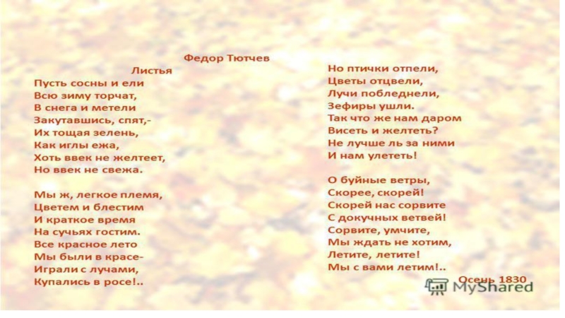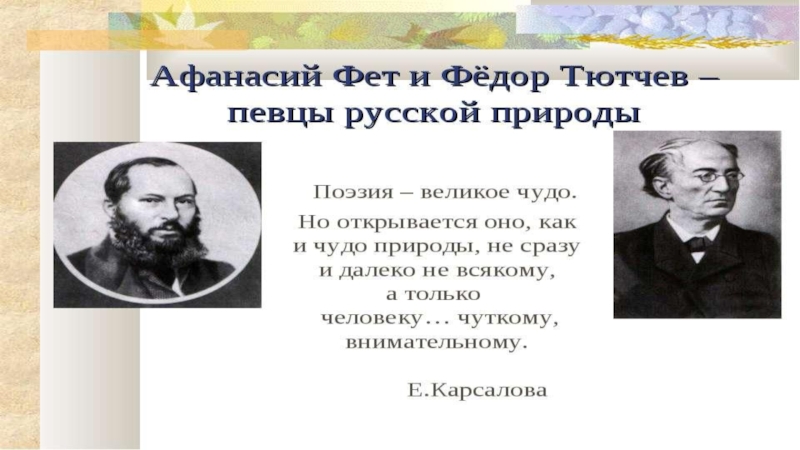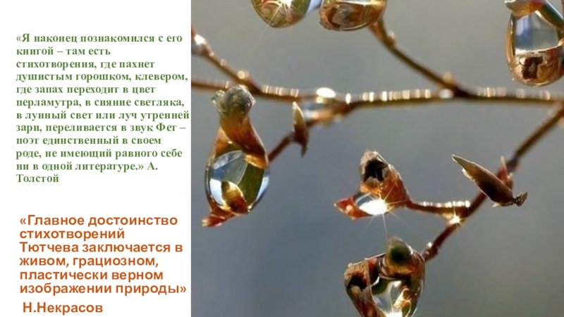 «Я наконец познакомился с его книгой – там есть стихотворения, где пахнет душистым горошком, клевером, где запах переходит в цвет перламутра, в сияние светляка, в лунный свет или луч утренней зари, переливается в звук Фет – поэт единственный в своем роде, не имеющий равного себе ни в одной литературе.» А. Толстой