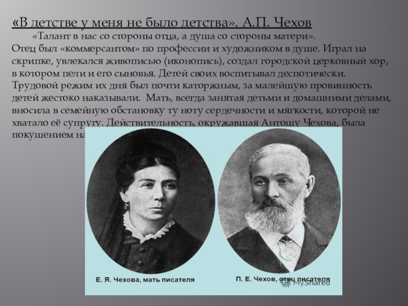 Отец был «коммерсантом» по профессии и художником в душе. Играл на скрипке, увлекался живописью (иконопись), создал городской церковный хор, в котором пели и его сыновья. Детей своих воспитывал деспотически. Трудовой режим их дня был почти каторжным, за малейшую провинность детей жестоко наказывали. Мать, всегда занятая детьми и домашними делами, вносила в семейную обстановку ту ноту сердечности и мягкости, которой не хватало её супругу. Действительность, окружавшая Антошу Чехова, была покушением на его свободу.