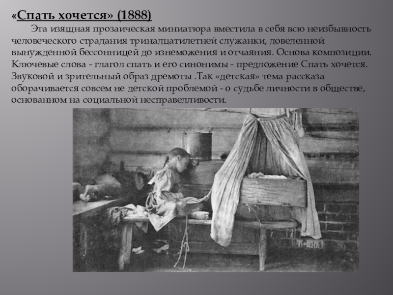 человеческого страдания тринадцатилетней служанки, доведенной вынужденной бессонницей до изнеможения и отчаяния. Основа композиции. Ключевые слова - глагол спать и его синонимы - предложение Спать хочется. Звуковой и зрительный образ дремоты .Так «детская» тема рассказа оборачивается совсем не детской проблемой - о судьбе личности в обществе, основанном на социальной несправедливости.