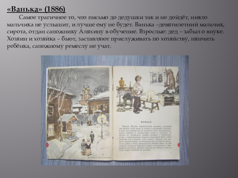 не дойдёт, никто мальчика не услышит, и лучше ему не будет. Ванька –девятилетний мальчик, сирота, отдан сапожнику Аляхину в обучение. Взрослые: дед – забыл о внуке. Хозяин и хозяйка – бьют, заставляют прислуживать по хозяйству, нянчить ребёнка, сапожному ремеслу не учат.
