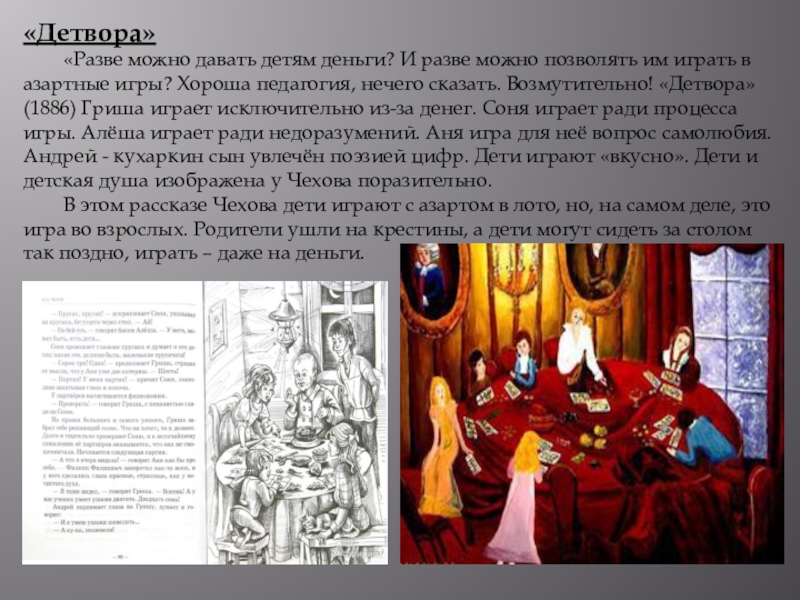 в азартные игры? Хороша педагогия, нечего сказать. Возмутительно! «Детвора» (1886) Гриша играет исключительно из-за денег. Соня играет ради процесса игры. Алёша играет ради недоразумений. Аня игра для неё вопрос самолюбия. Андрей - кухаркин сын увлечён поэзией цифр. Дети играют «вкусно». Дети и детская душа изображена у Чехова поразительно.