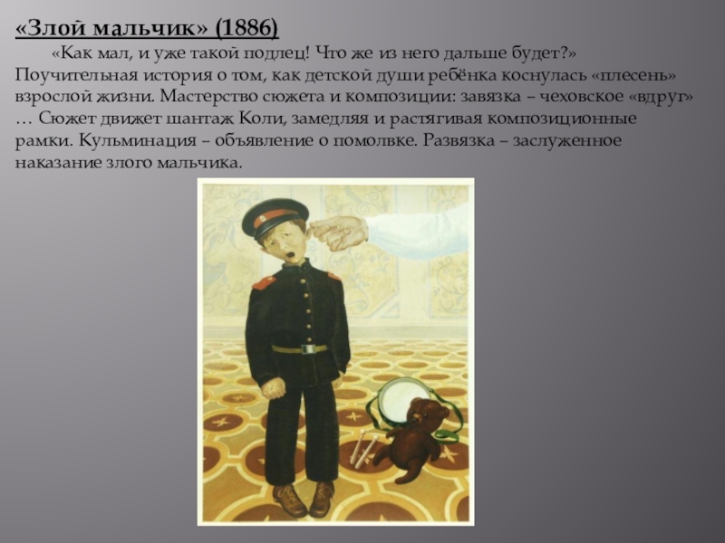 него дальше будет?» Поучительная история о том, как детской души ребёнка коснулась «плесень» взрослой жизни. Мастерство сюжета и композиции: завязка – чеховское «вдруг»… Сюжет движет шантаж Коли, замедляя и растягивая композиционные рамки. Кульминация – объявление о помолвке. Развязка – заслуженное наказание злого мальчика.