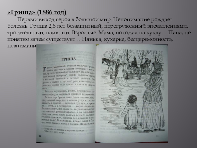 Гриша 2,8 лет беззащитный, перегруженный впечатлениями, трогательный, наивный. Взрослые: Мама, похожая на куклу… Папа, не понятно зачем существует… Нянька, кухарка, бесцеремонность, невнимание, грубость.