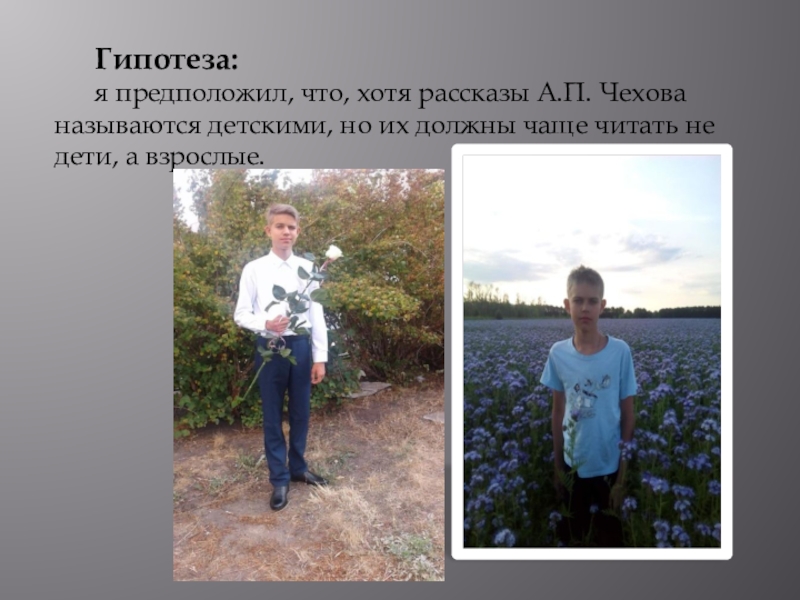 так называемой детской литературы не люблю и не признаю…» А. П. Чехов. Дети у Чехова – выразители высоких принципов морали, человечности, противостоящих устоявшимся шаблонам житейского поведения. Исследовал все стадии взросления от младенца до подростка. Не только прекрасно изображал внешность ребёнка, особенности его речи, но и умел «мыслить на его манер». Указывал на душевную чёрствость и эгоизм взрослых, которые не хотят вглядываться в своего ребёнка, понять, что происходит в его душе. Порицал родителей, учителей, безразличных к детям, к их интересам, особенностям психики. Обнаружил, что в кругу детей нет разделения на социальные группы. Выступил адвокатом ребят, обремененных непосильным трудом. Знание души ребёнка и разумная любовь к маленькому человеку могут воспитать в нём добрые начала.