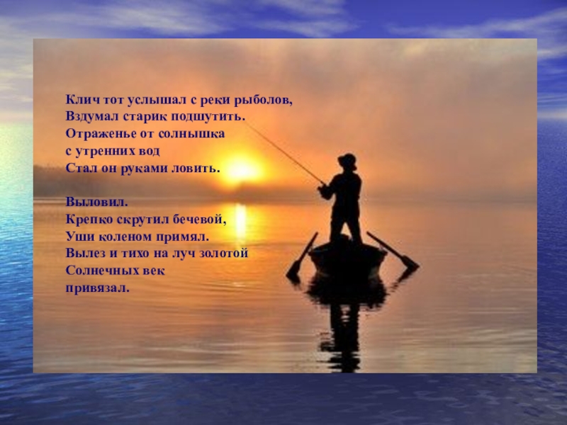Клич тот услышал с реки рыболов, Вздумал старик подшутить. Отраженье от солнышка