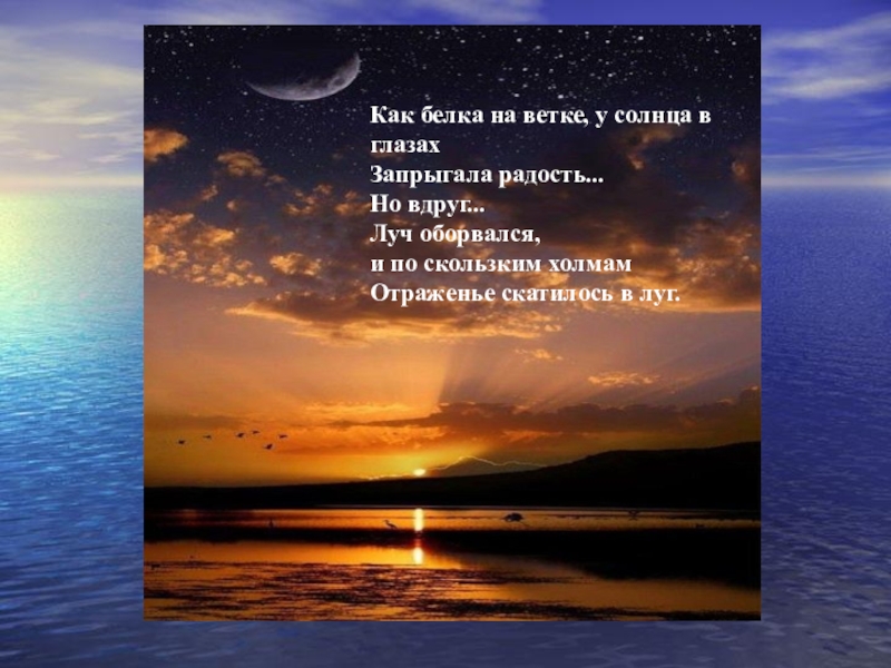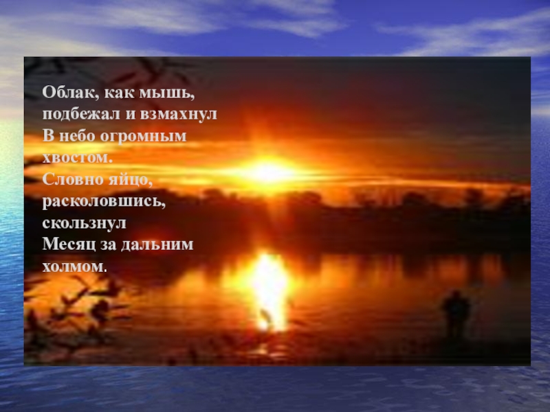 Слайд 2Облак, как мышь, подбежал и взмахнул В небо огромным хвостом. Словно яйцо, расколовшись, скользнул Месяц за