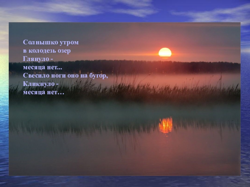 Солнышко утром в колодезь озер Глянуло - месяца нет... Свесило ноги оно на бугор, Кликнуло - месяца