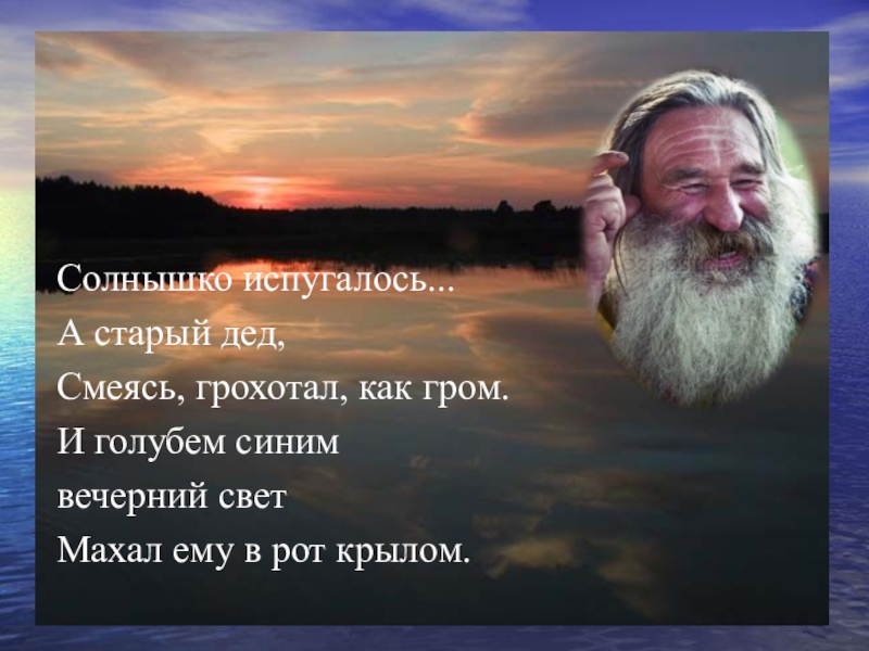 Солнышко испугалось...А старый дед,Смеясь, грохотал, как гром.И голубем синимвечерний светМахал ему в рот крылом.