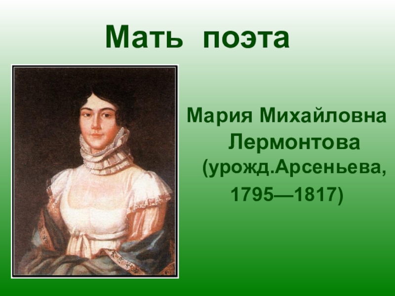 Мать поэтаМария Михайловна Лермонтова (урожд.Арсеньева, 1795—1817)