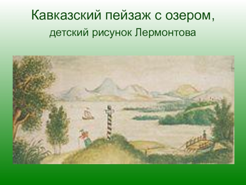 Слайд 16Кавказский пейзаж с озером, детский рисунок Лермонтова
