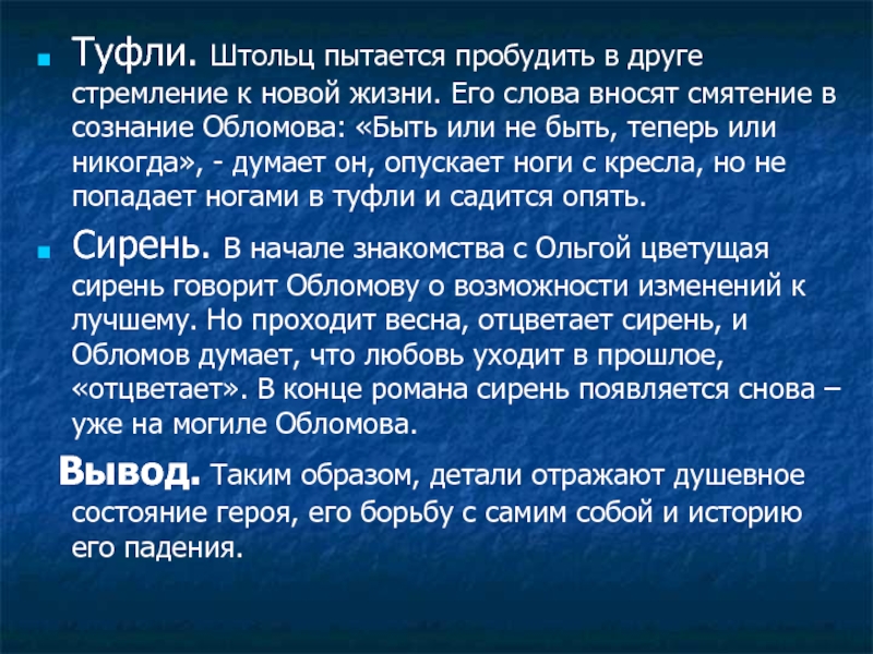 слова вносят смятение в сознание Обломова: «Быть или не быть, теперь или никогда», - думает он, опускает ноги с кресла, но не попадает ногами в туфли и садится опять.