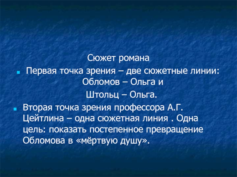 Вторая точка зрения профессора А.Г.Цейтлина – одна сюжетная линия . Одна цель: показать постепенное превращение Обломова в «мёртвую душу».