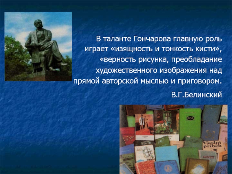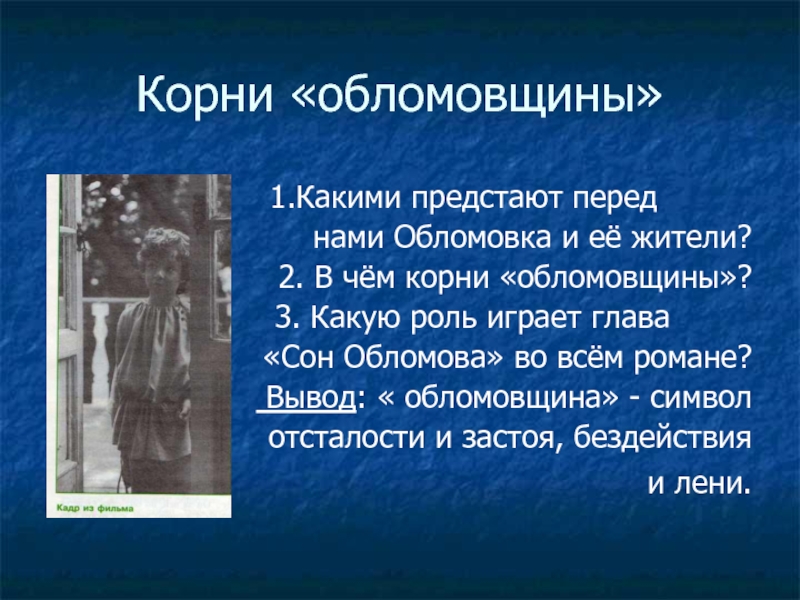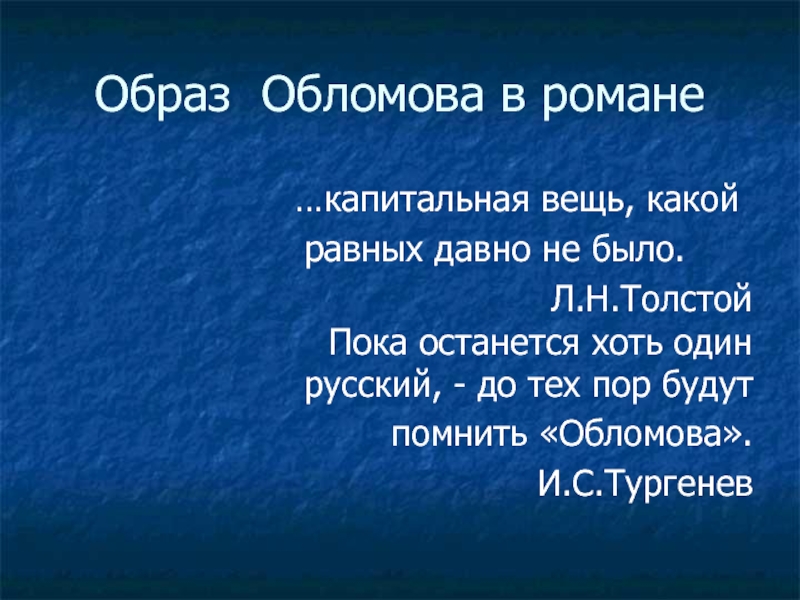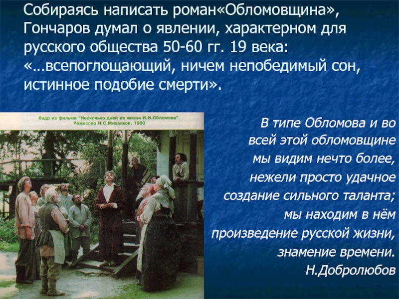 «совершеннейшая инертность, происходящая от апатии ко всему на свете», - присуща каждому русскому человеку. «В каждом из нас сидит значительная часть Обломова… Обломовка есть наша прямая родина».