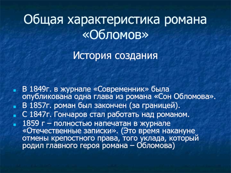 1859 г – полностью напечатан в журнале «Отечественные записки». (Это время накануне отмены крепостного права, того уклада, который родил главного героя романа – Обломова)