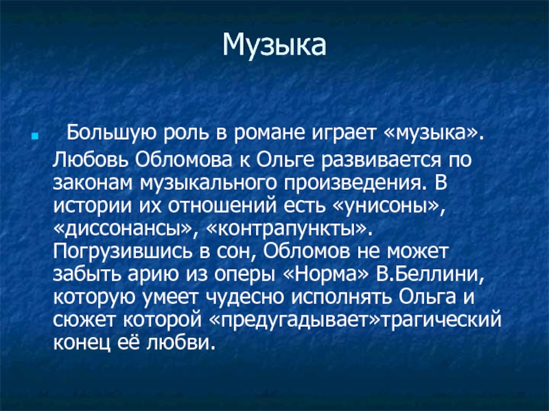 Ольге развивается по законам музыкального произведения. В истории их отношений есть «унисоны», «диссонансы», «контрапункты». Погрузившись в сон, Обломов не может забыть арию из оперы «Норма» В.Беллини, которую умеет чудесно исполнять Ольга и сюжет которой «предугадывает»трагический конец её любви.