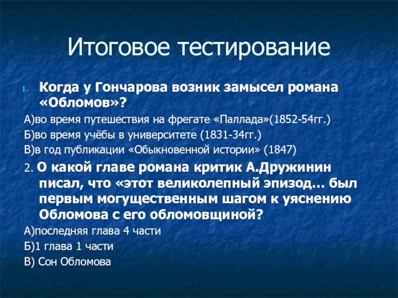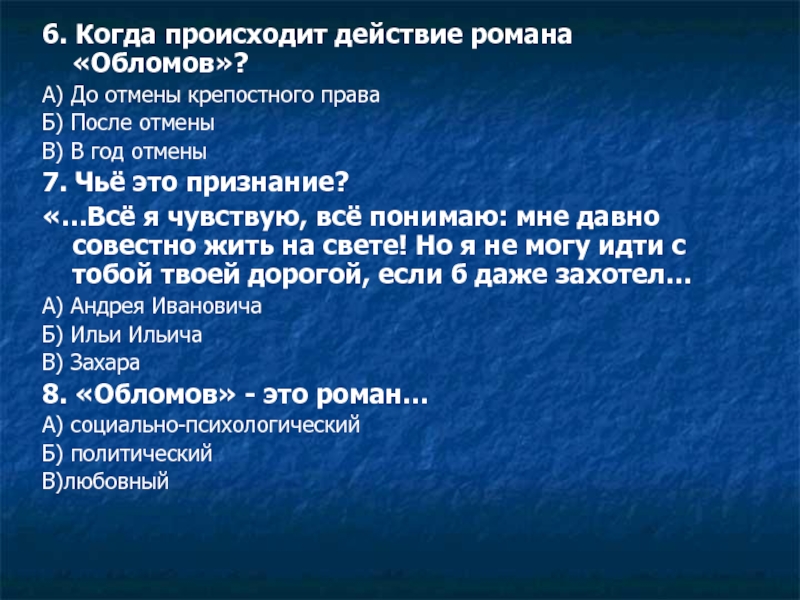 Слайд 406. Когда происходит действие романа «Обломов»?