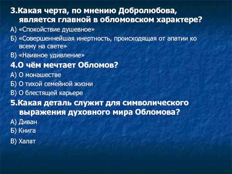 Слайд 393.Какая черта, по мнению Добролюбова, является главной в обломовском характере?