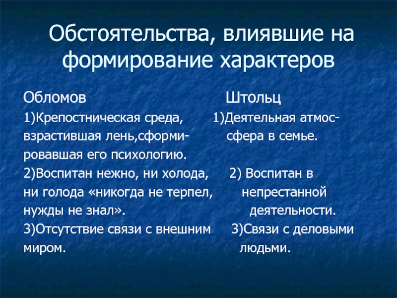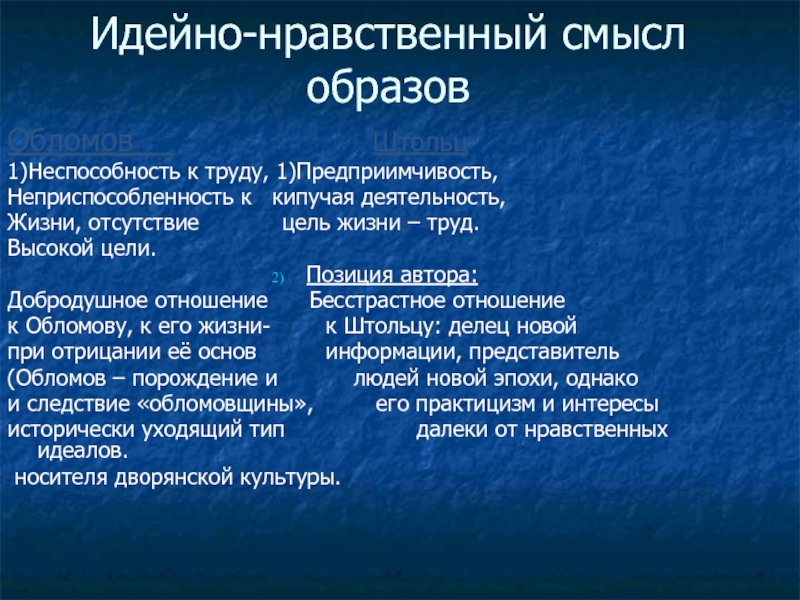 Построение романа задумано по принципу изображения двух противоположных жизненных судеб: Обломова