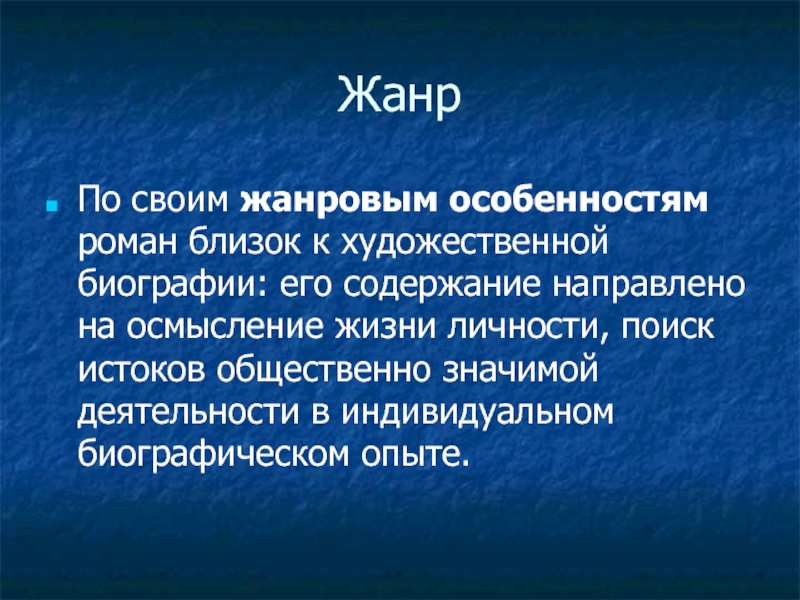 По своим жанровым особенностям роман близок к художественной биографии: его содержание