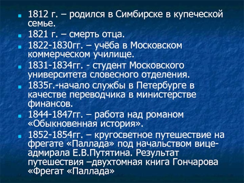 Слайд 2Основные этапы жизни и творчества И.А.Гончарова