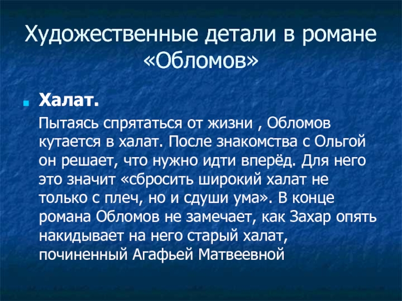 , Обломов кутается в халат. После знакомства с Ольгой он решает, что нужно идти вперёд. Для него это значит «сбросить широкий халат не только с плеч, но и сдуши ума». В конце романа Обломов не замечает, как Захар опять накидывает на него старый халат, починенный Агафьей Матвеевной
