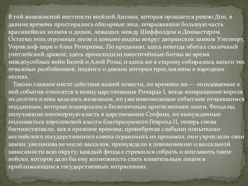Таково главное место действия нашей повести, по времени же — описываемые в ней события относятся к концу царствования Ричарда I, когда возвращение короля из долгого плена казалось желанным, но уже невозможным событием отчаявшимся подданным, которые подвергались бесконечным притеснениям знати. Феодалы, получившие непомерную власть в царствование Стефана, но вынужденные подчиняться королевской власти благоразумного Генриха II, теперь снова бесчинствовали, как в прежние времена; пренебрегая слабыми попытками английского государственного совета ограничить их произвол, они укрепляли свои замки, увеличивали число вассалов, принуждали к повиновению и вассальной зависимости всю округу; каждый феодал стремился собрать и возглавить такое войско, которое дало бы ему возможность стать влиятельным лицом в приближающихся государственных потрясениях.