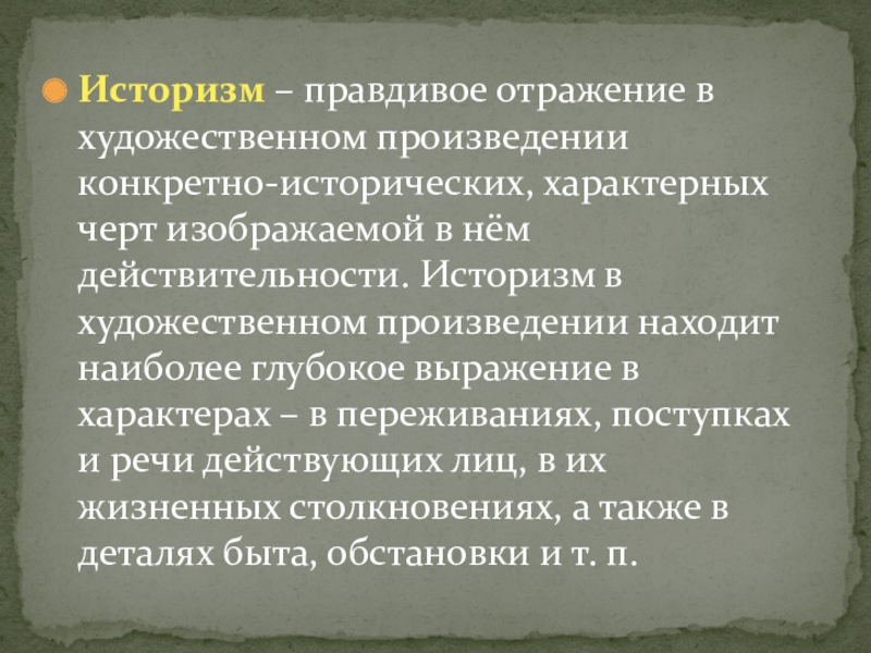 Слайд 8Историзм – правдивое отражение в художественном произведении конкретно-исторических, характерных черт изображаемой