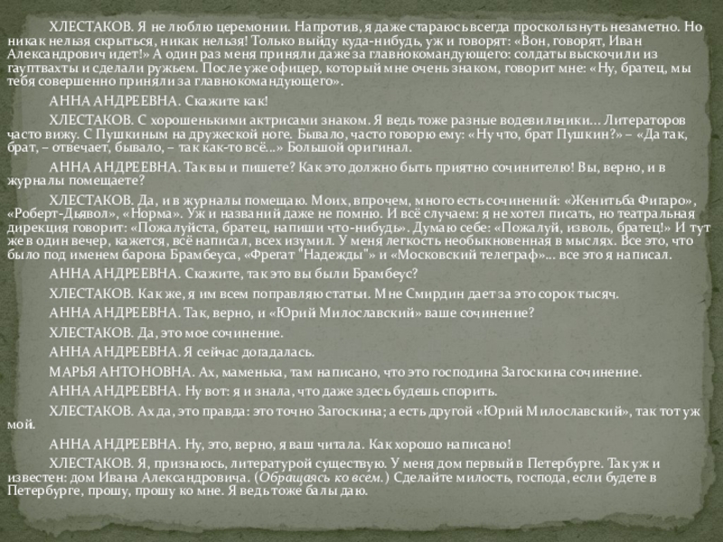 ХЛЕСТАКОВ. Да, и в журналы помещаю. Моих, впрочем, много есть сочинений: «Женитьба Фигаро», «Роберт-Дьявол», «Норма». Уж и названий даже не помню. И всё случаем: я не хотел писать, но театральная дирекция говорит: «Пожалуйста, братец, напиши что-нибудь». Думаю себе: «Пожалуй, изволь, братец!» И тут же в один вечер, кажется, всё написал, всех изумил. У меня легкость необыкновенная в мыслях. Все это, что было под именем барона Брамбеуса, «Фрегат "Надежды"» и «Московский телеграф»... все это я написал.