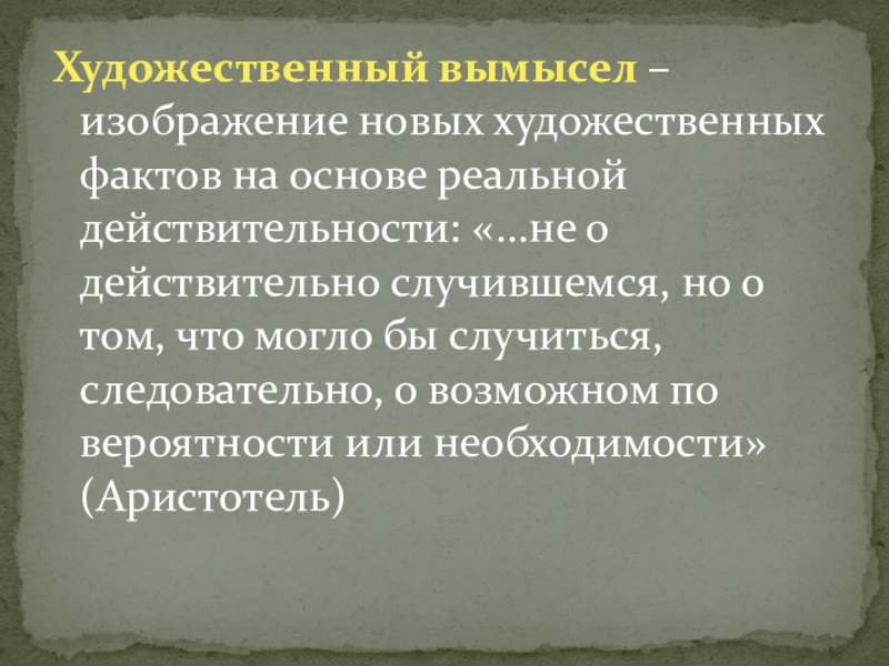 Слайд 9Художественный вымысел – изображение новых художественных фактов на основе реальной действительности: