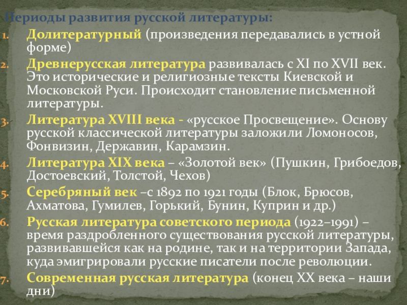 Серебряный век –с 1892 по 1921 годы (Блок, Брюсов, Ахматова, Гумилев, Горький, Бунин, Куприн и др.)