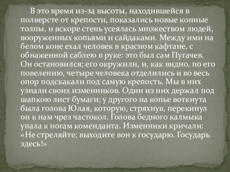 новые конные толпы, и вскоре степь усеялась множеством людей, вооруженных копьями и сайдаками. Между ими на белом коне ехал человек в красном кафтане, с обнаженной саблею в руке: это был сам Пугачев. Он остановился; его окружили, и, как видно, по его повелению, четыре человека отделились и во весь опор подскакали под самую крепость. Мы в них узнали своих изменников. Один из них держал под шапкою лист бумаги; у другого на копье воткнута была голова Юлая, которую, стряхнув, перекинул он к нам чрез частокол. Голова бедного калмыка упала к ногам коменданта. Изменники кричали: «Не стреляйте; выходите вон к государю. Государь здесь!»