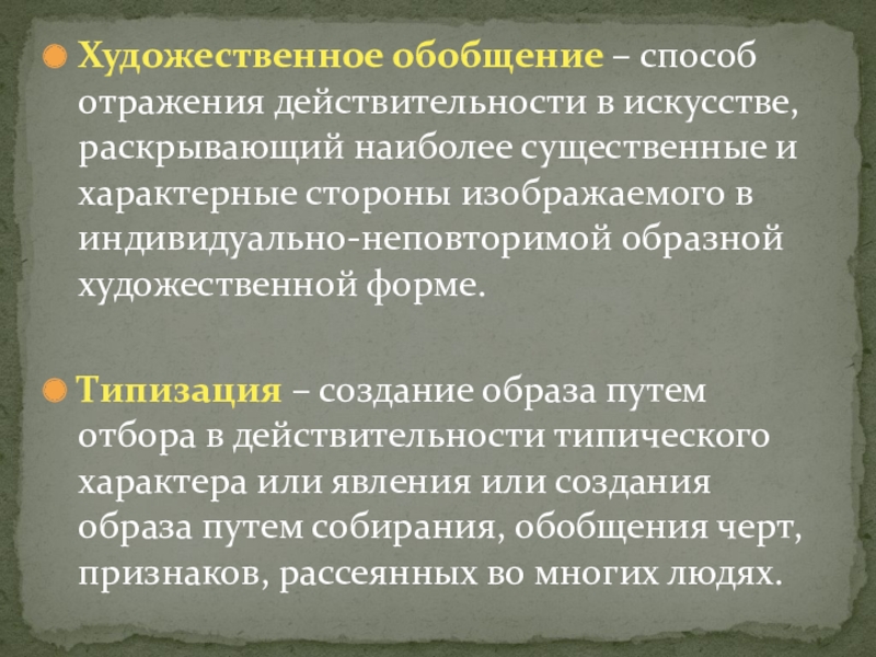 Слайд 10Художественное обобщение – способ отражения действительности в искусстве, раскрывающий наиболее существенные
