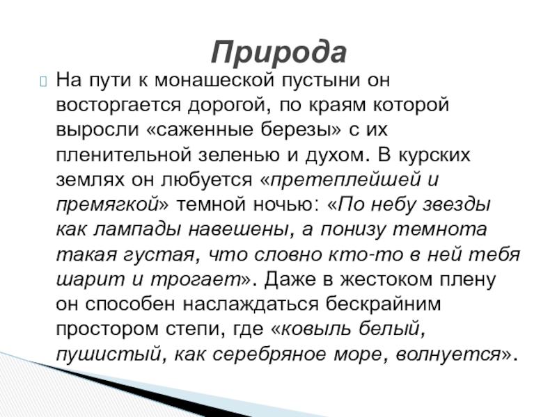 выросли «саженные березы» с их пленительной зеленью и духом. В курских землях он любуется «претеплейшей и премягкой» темной ночью: «По небу звезды как лампады навешены, а понизу темнота такая густая, что словно кто-то в ней тебя шарит и трогает». Даже в жестоком плену он способен наслаждаться бескрайним простором степи, где «ковыль белый, пушистый, как серебряное море, волнуется».