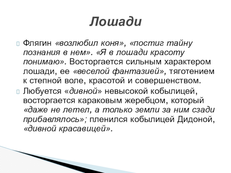 Слайд 25Флягин «возлюбил коня», «постиг тайну познания в нем». «Я в лошади