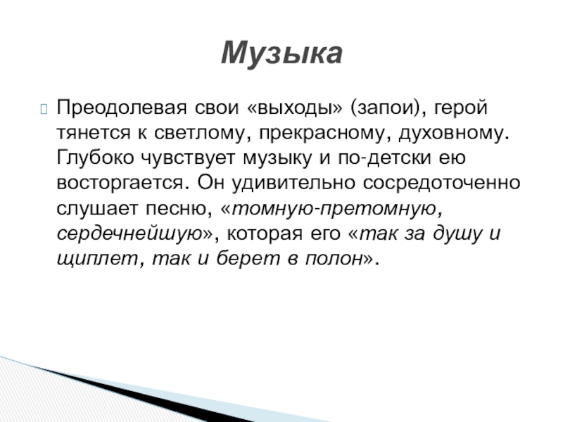 Слайд 24Преодолевая свои «выходы» (запои), герой тянется к светлому, прекрасному, духовному. Глубоко
