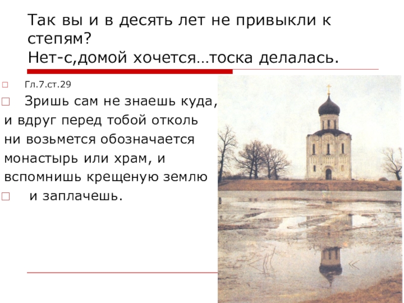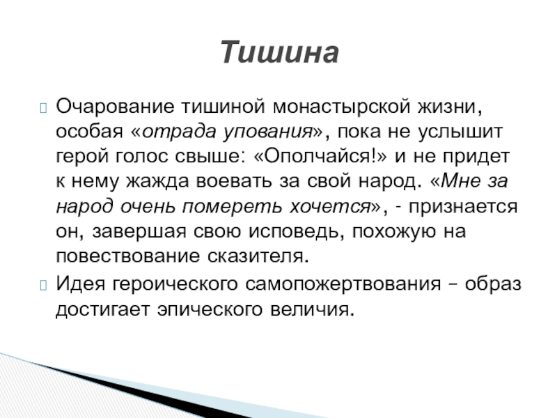 Слайд 31Очарование тишиной монастырской жизни, особая «отрада упования», пока не услышит герой