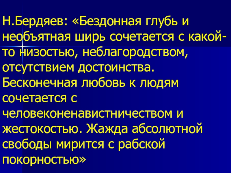 Слайд 5Н.Бердяев: «Бездонная глубь и необъятная ширь сочетается с какой-то низостью, неблагородством,
