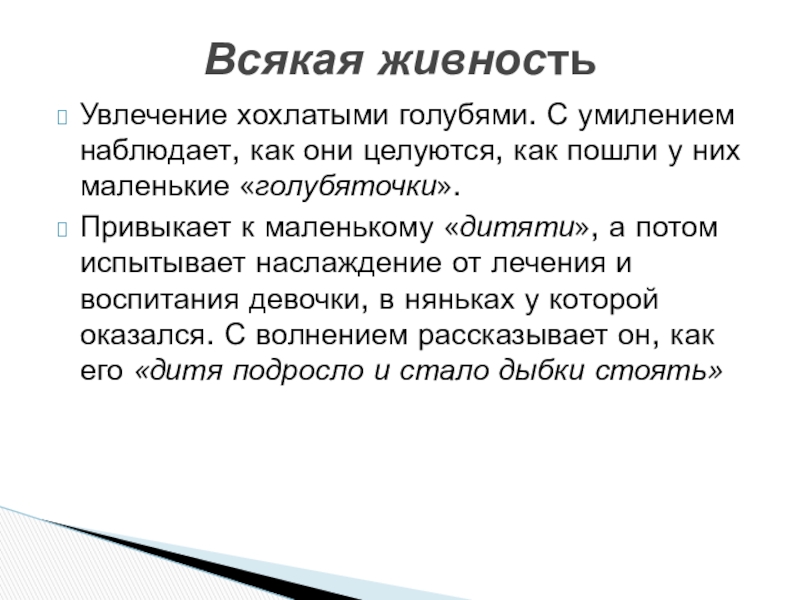Слайд 21Увлечение хохлатыми голубями. С умилением наблюдает, как они целуются, как пошли