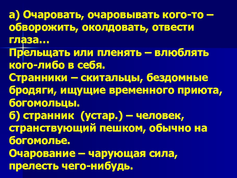 Слайд 7а) Очаровать, очаровывать кого-то – обворожить, околдовать, отвести глаза…