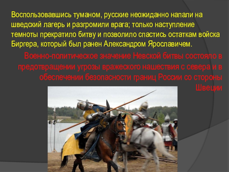 Слайд 6Воспользовавшись туманом, русские неожиданно напали на шведский лагерь и разгромили врага;