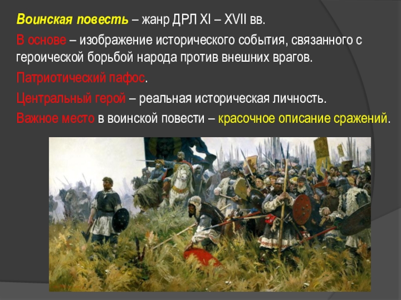Слайд 13Воинская повесть – жанр ДРЛ XI – XVII вв.