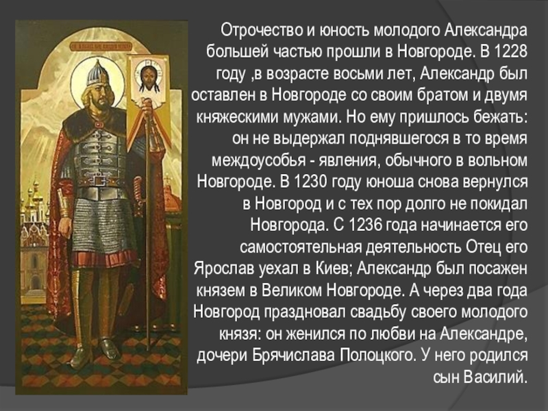 1228 году ,в возрасте восьми лет, Александр был оставлен в Новгороде со своим братом и двумя княжескими мужами. Но ему пришлось бежать: он не выдержал поднявшегося в то время междоусобья - явления, обычного в вольном Новгороде. В 1230 году юноша снова вернулся в Новгород и с тех пор долго не покидал Новгорода. С 1236 года начинается его самостоятельная деятельность Отец его Ярослав уехал в Киев; Александр был посажен князем в Великом Новгороде. А через два года Новгород праздновал свадьбу своего молодого князя: он женился по любви на Александре, дочери Брячислава Полоцкого. У него родился сын Василий.