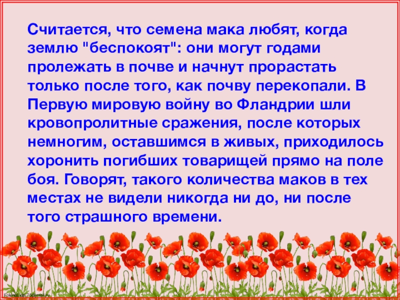 пролежать в почве и начнут прорастать только после того, как почву перекопали. В Первую мировую войну во Фландрии шли кровопролитные сражения, после которых немногим, оставшимся в живых, приходилось хоронить погибших товарищей прямо на поле боя. Говорят, такого количества маков в тех местах не видели никогда ни до, ни после того страшного времени.