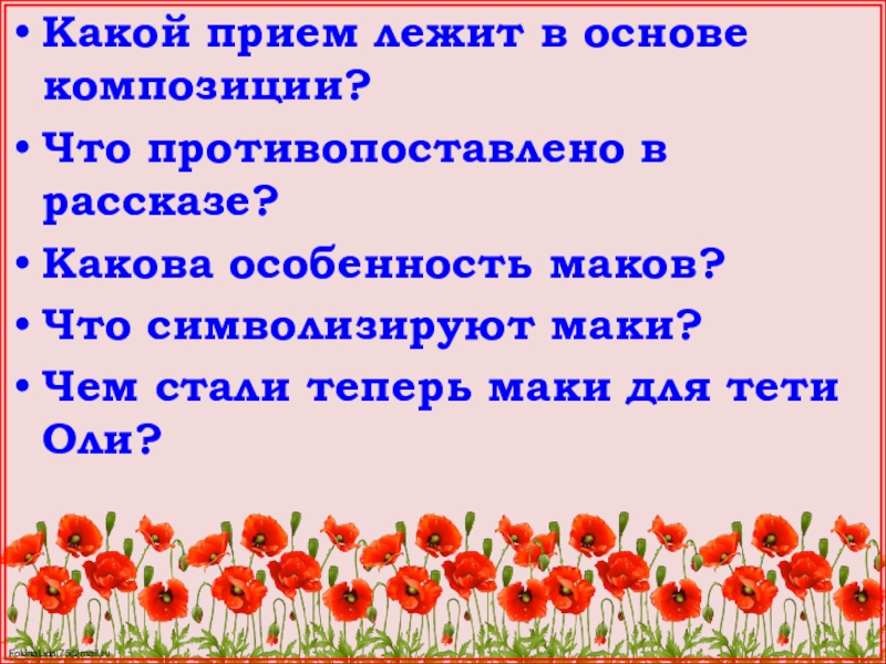 также нет описаний военных событий, и о войне автор упоминает вскользь. Всего лишь несколько предложений передают весь ужас войны. Тема войны входит через деталь, причём совершенно мирную – цветущие маки, ставшие в рассказе символом памяти о войне.