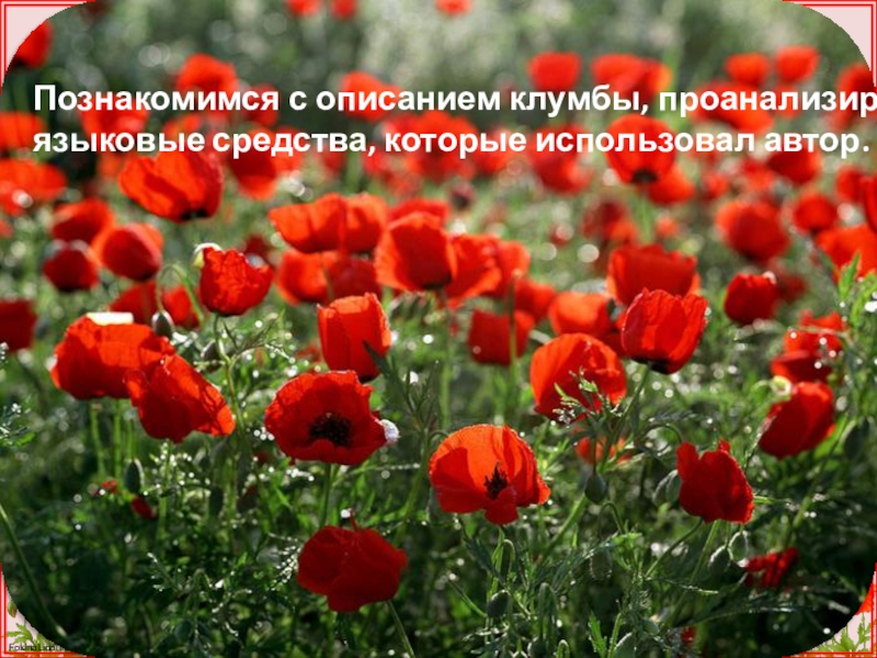 Слайд 25Познакомимся с описанием клумбы, проанализируем языковые средства, которые использовал автор.