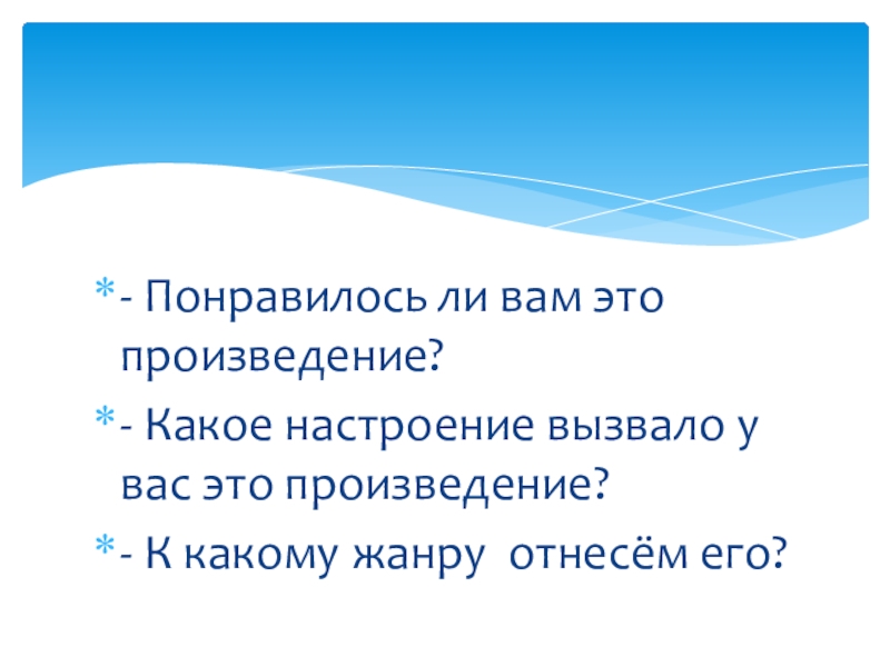 - Понравилось ли вам это произведение?- Какое настроение вызвало у вас это произведение?- К какому жанру отнесём