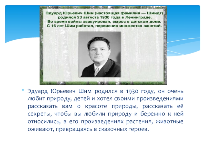 Эдуард Юрьевич Шим родился в 1930 году, он очень любит природу, детей и хотел своими произведениями рассказать