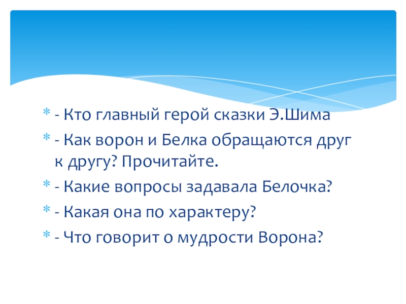 - Кто главный герой сказки Э.Шима- Как ворон и Белка обращаются друг к другу? Прочитайте.- Какие вопросы