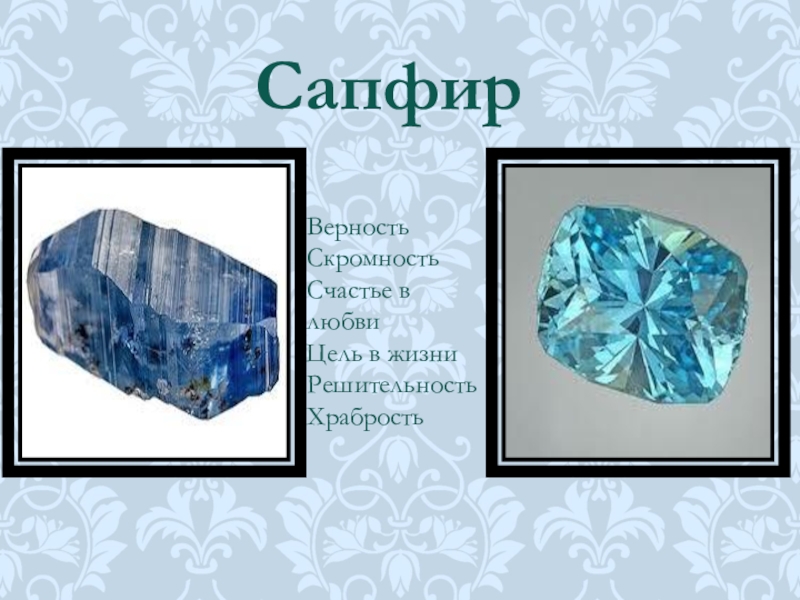 СапфирВерностьСкромностьСчастье в любвиЦель в жизниРешительностьХрабрость