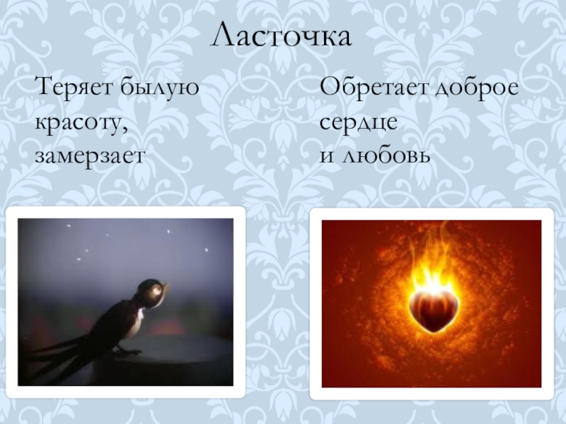 ЛасточкаТеряет былую красоту,замерзаетОбретает доброе сердцеи любовь